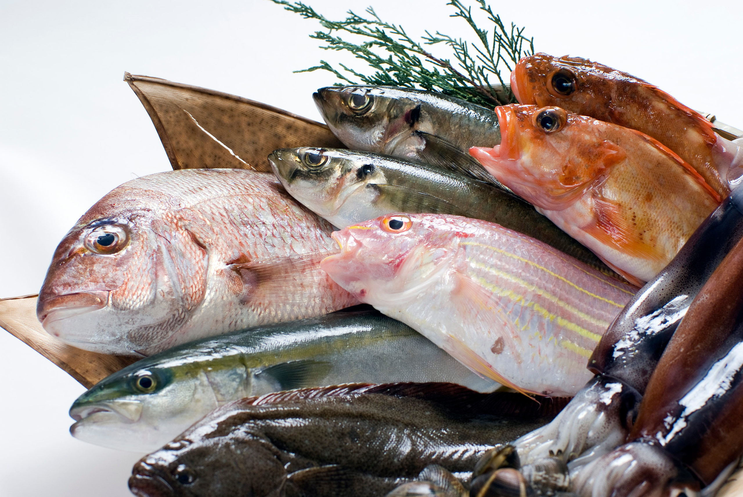 毎日市場に届く、鮮度の高い魚類、甲殻類、貝類、海藻類、